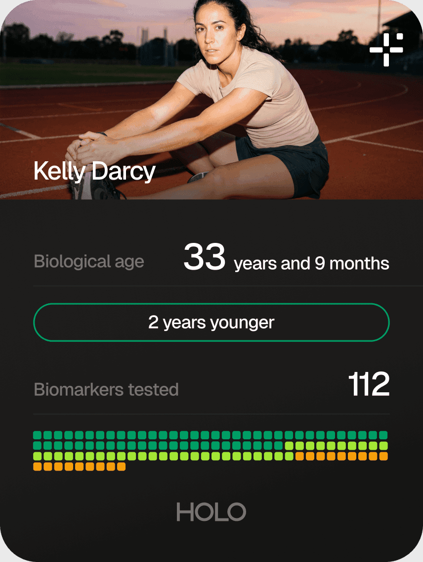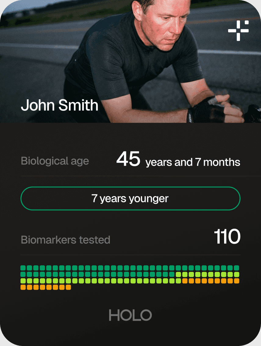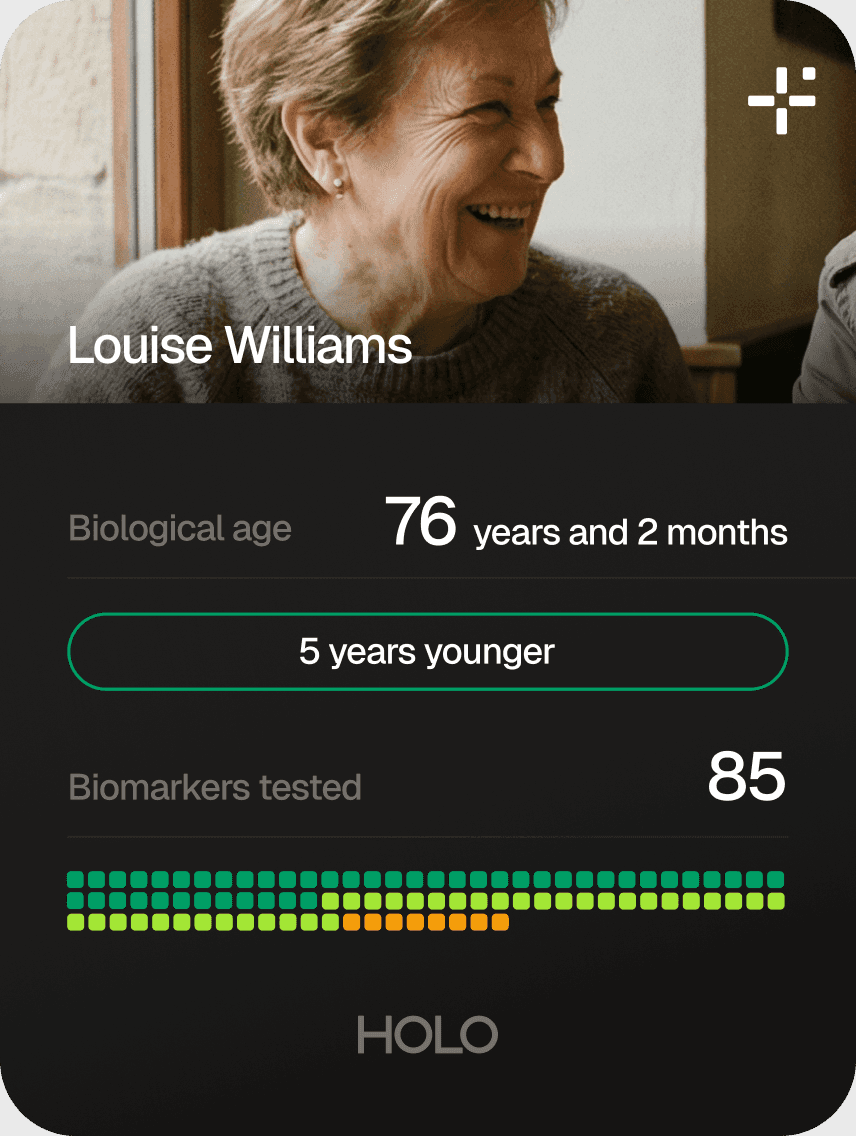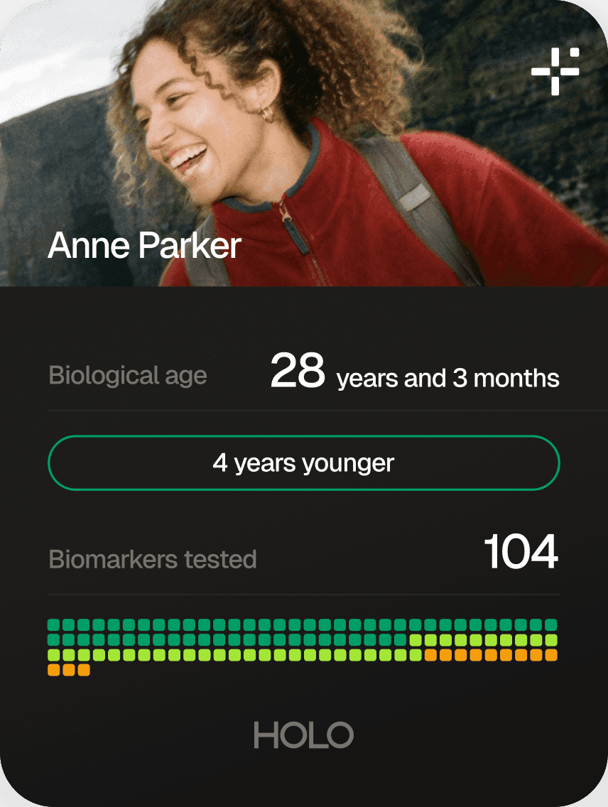 Holo is designed for anyone over 18. It gives you a clear picture of your health today and how it evolves over time. The earlier you start, the more data you’ll have to take action early.