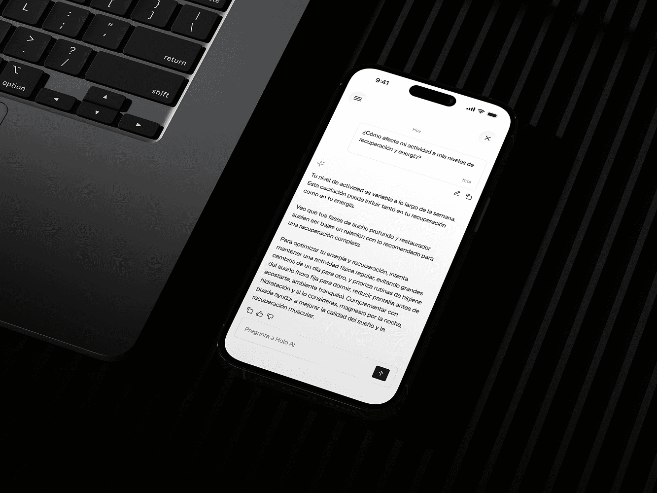 Haz seguimiento de los resultados de tus analíticas junto con datos de esfuerzo, recuperación y sueño de tus dispositivos conectados. Holo lo conecta todo y responde a tus preguntas con tu contexto, en un solo lugar.